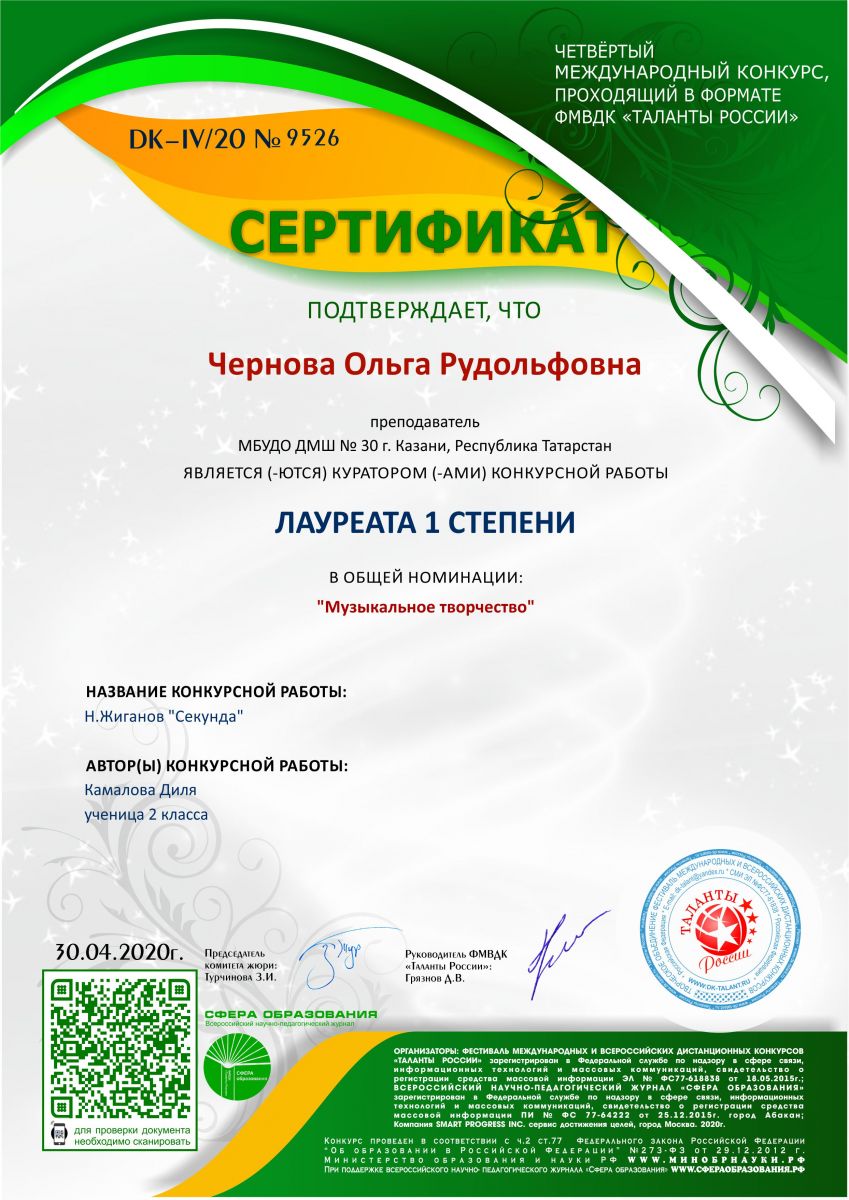 Международный конкурс "Таланты России"- Чернова О.Р. - сертификат о подготовке лауреата I степени Камаловой Дили