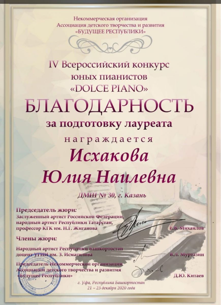 IV Всероссийский конкурс юных пианистов "DOLCE PIANO" - Исхакова Ю.Н. - Благодарственное письмо