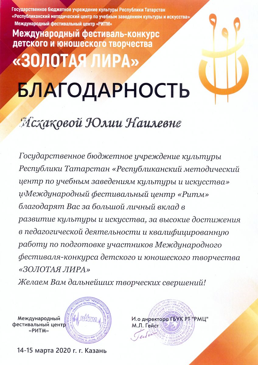 Международный фестиваль-конкурс детского и юношеского творчества "ЗОЛОТАЯ ЛИРА" - Исхакова Ю.Н. - Благодарственное письмо