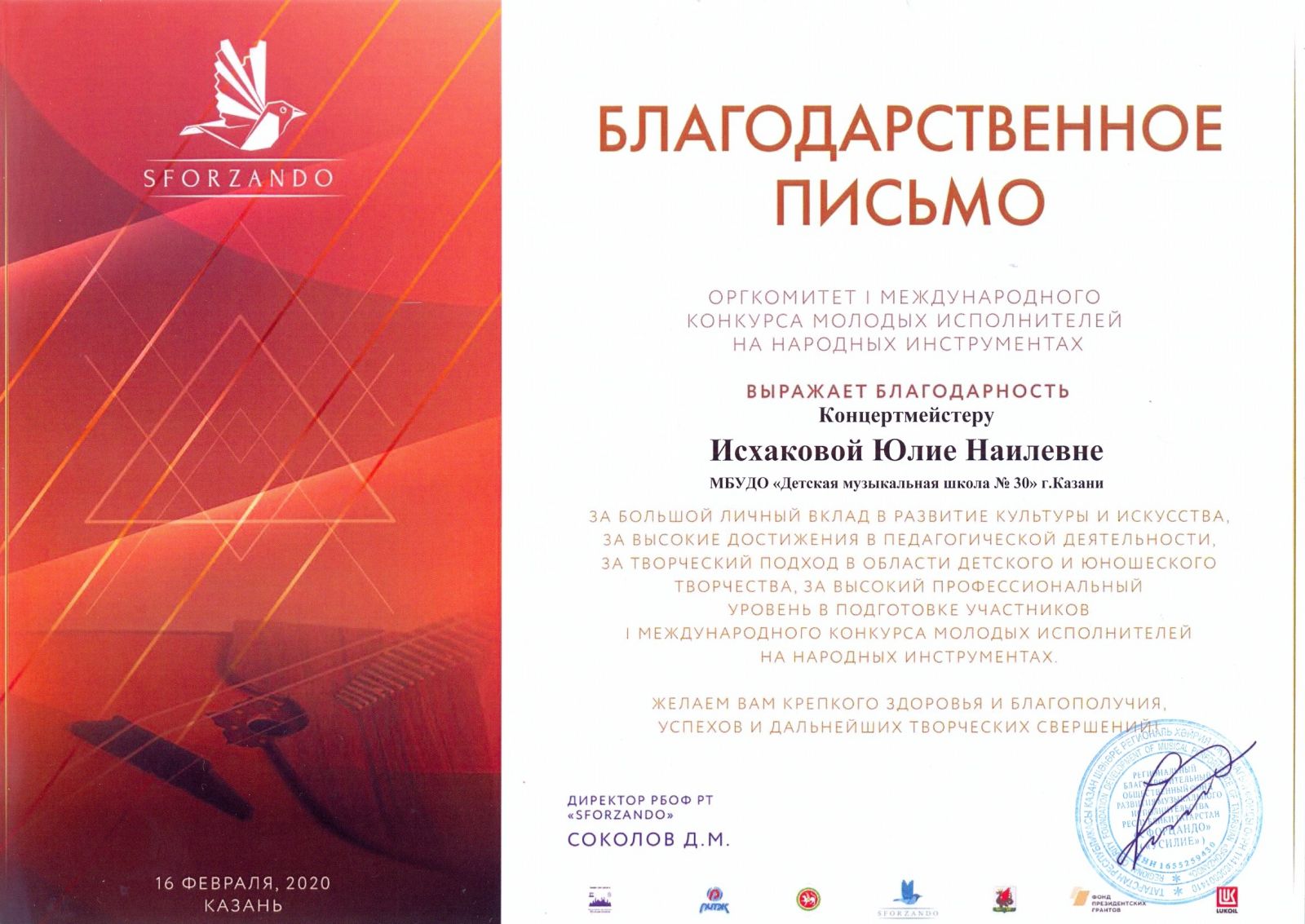 I Международный конкурс исполнителей на народных инструментах "SFORZANDO" - Исхакова Ю.Н. - Благодарственное письмо