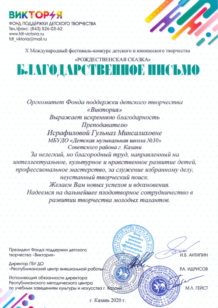 X Международный фестиваль-конкурс детского и юношеского творчества "Рождетсвенская сказка" - Исрафилова Г. М. - Благодарственное письмо за профессиональное мастерство