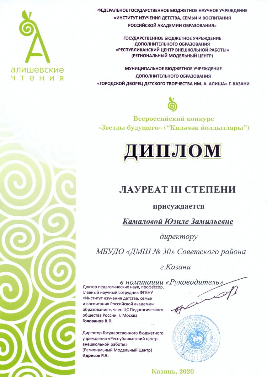 Всероссийский конкурс "Звезды будущего" ("Киләчәк йәлдызлары") в рамках Алишевских чтений - Камалова Ю.З. - III место в номинации "Руководитель"