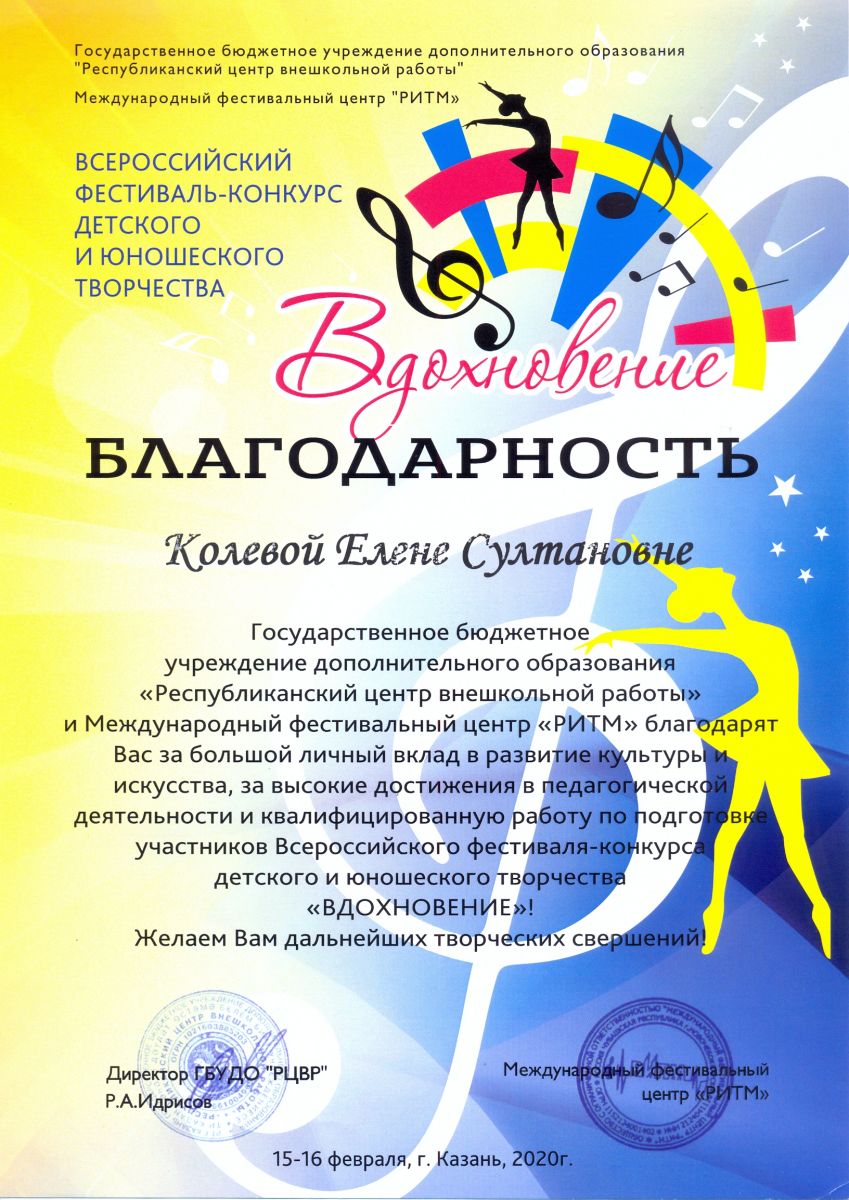 Всероссийский фестиваль-конкурс детского и юношеского творчества "Вдохновение" - Колева Е.С. - Благодарственное письмо