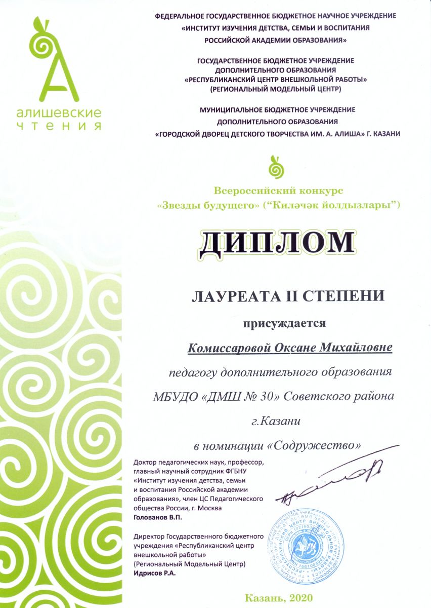 Всероссийский конкурс "Звезды будущего" ("Киләчәк йәлдызлары") в рамках Алишевских чтений - Комиссарова О.М. - II место в номинации "Содружество"
