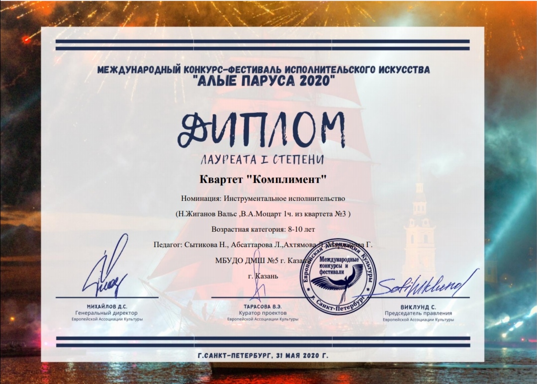 Международный конкурсфестиваль исполнительского искусства "Алые паруса" - квартет "Комплимент" - I место