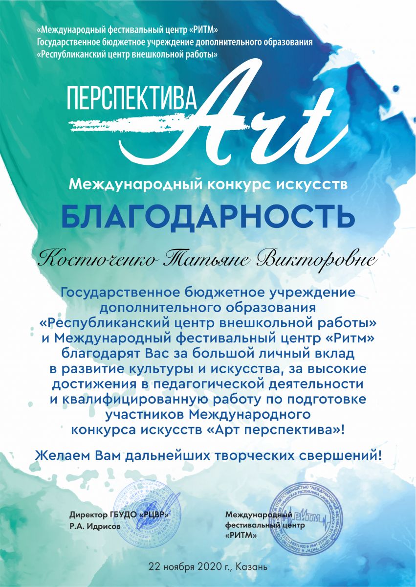 Международный конкурс искусств "Арт Перспектива" - Костюченко Т.В. - Благодарственное письмо