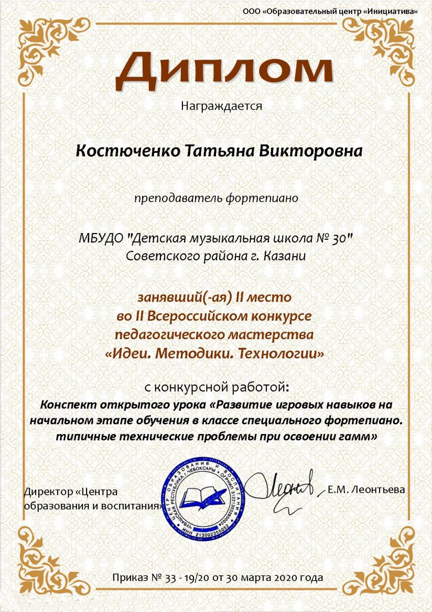 II Всероссийский конкурс педагогического мастерства "Идеи.Методики.Технологии" - Костюченко Т.В. - II место