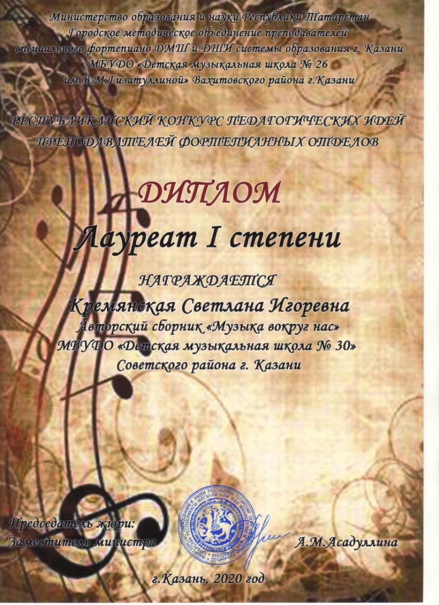 Республиканский конкурс педагогических идей преподавателей фортепианных отделов - Кремянская С.И. - I место (сборник "Музыка вокруг нас")