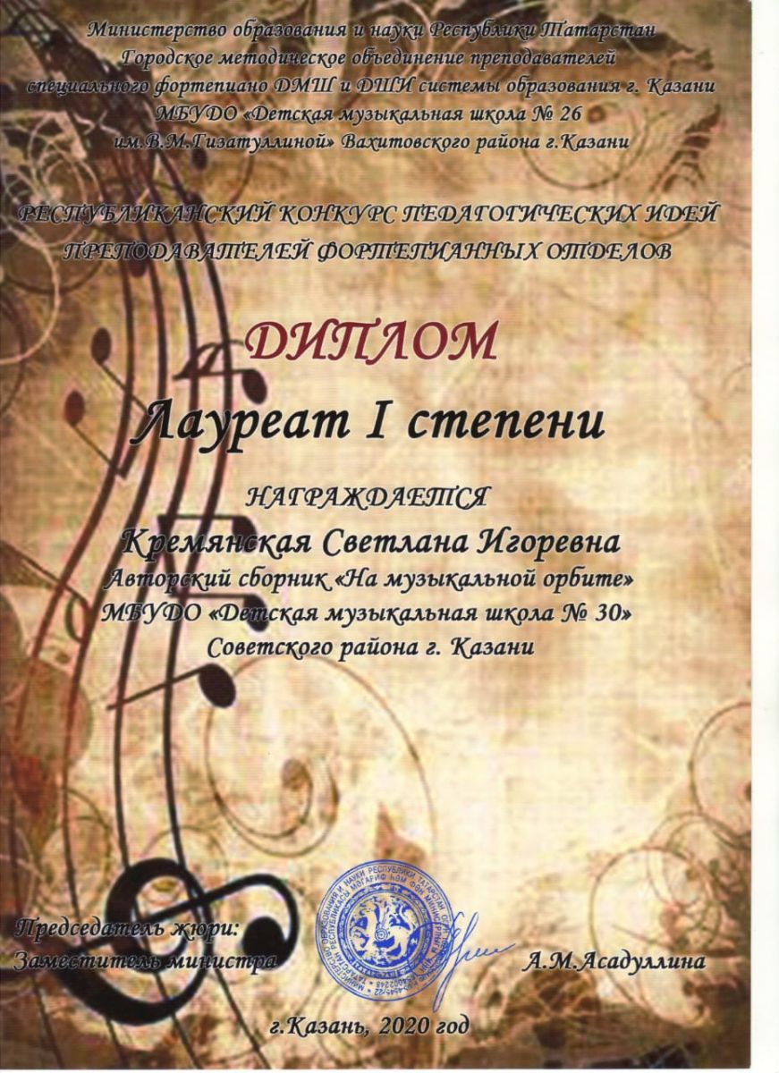 Республиканский конкурс педагогических идей преподавателей фортепианных отделов - Кремянская С.И. - I место (сборник "На музыкальной орбите")