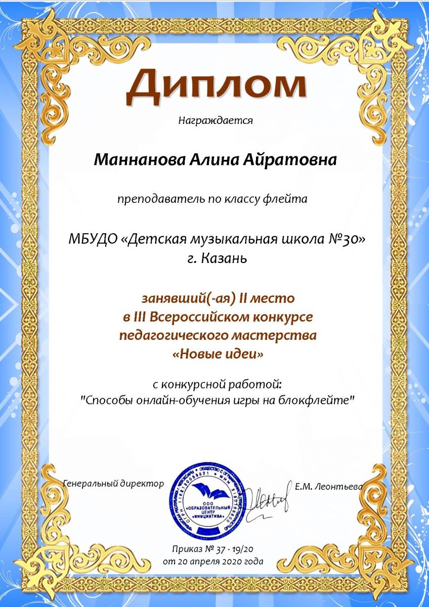 III Всероссийский конкурс педагогического мастерства "Новые идеи" - Маннанова А.А. - II место