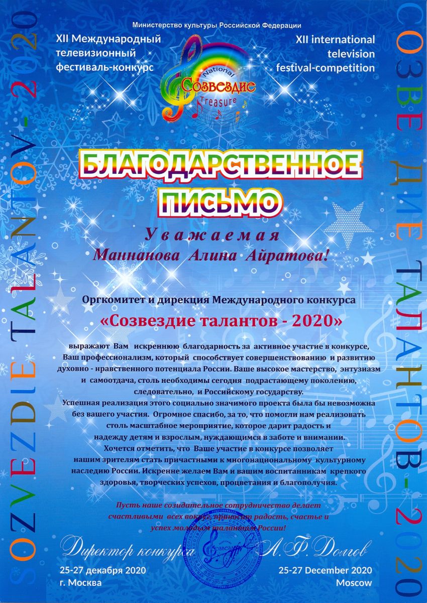XII Международный телевизионный фестиваль-кокнурс "Созвездие талантов" - Маннанова А.А. - Благодарственное письмо