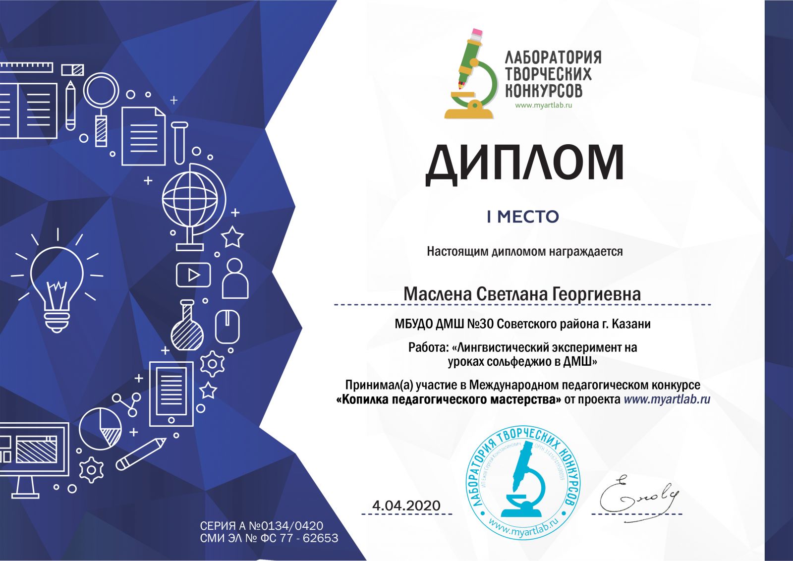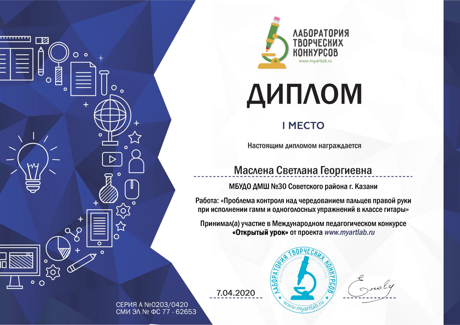 Международный дистанционный педагогический конкурс "Открытый урок" - Маслена С.Г. - I место