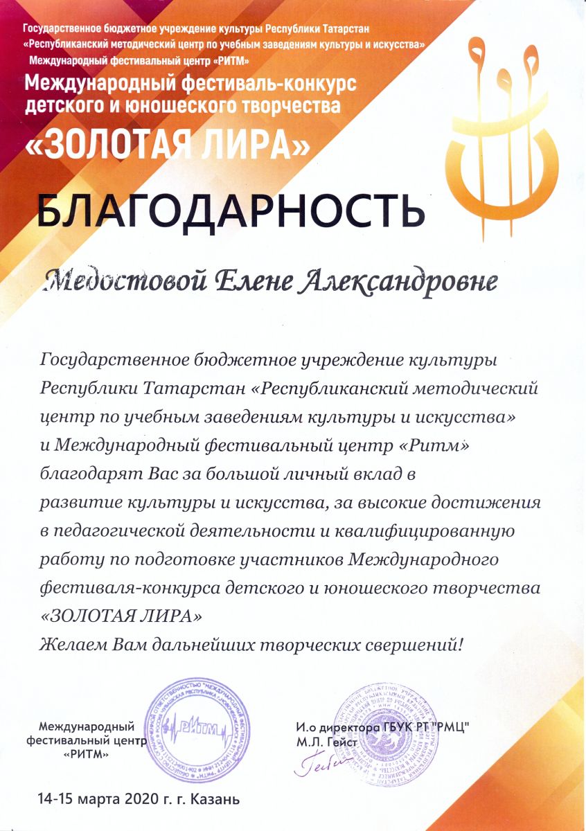 Международный фестиваль-конкурс детского и юношеского творчества "ЗОЛОТАЯ ЛИРА" - Медостова Е.А. - Благодарственное письмо