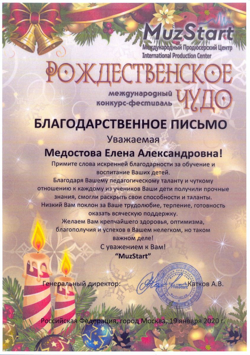Международный конкурс-фестиваль "Рождественское чудо" - Медостова Е.А. - Благодарственное письмо