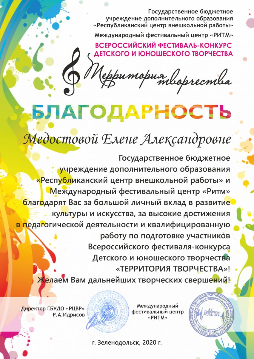 Всероссийский фестиваль-конкурс детского и юношеского творчества "Территория творчества" (г.Зеленодольск) - Медостова Е.А. - Благодарственное письмо