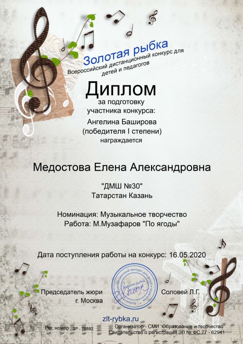 Всероссийский дистанционный конкурс для детей и педагогов "Золотая рыбка" - Медостова Е.А. - диплом за подготовку лауреата