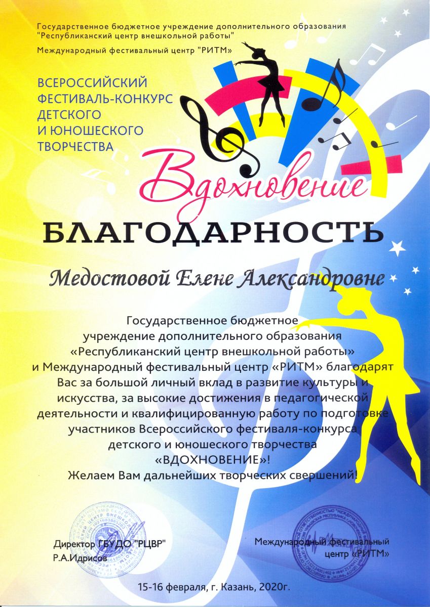 Всероссийский фестиваль-конкурс детского и юношеского творчества "Вдохновение" - Медостова Е.А. - Благодарственное письмо