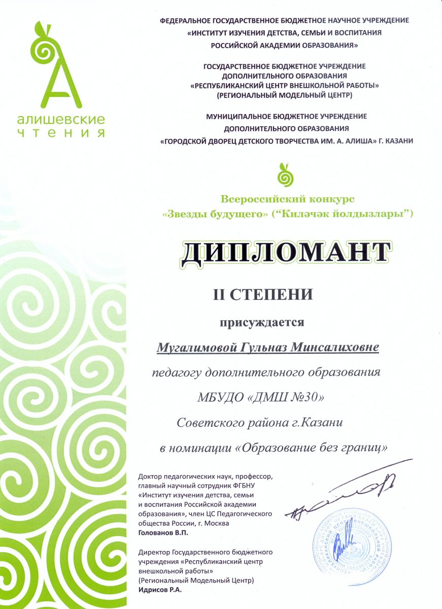 Всероссийский конкурс "Звезды будущего" ("Киләчәк йәлдызлары") в рамках Алишевских чтений - Мугалимова Г.М. - диплом II степени в номинации "Образование без границ"