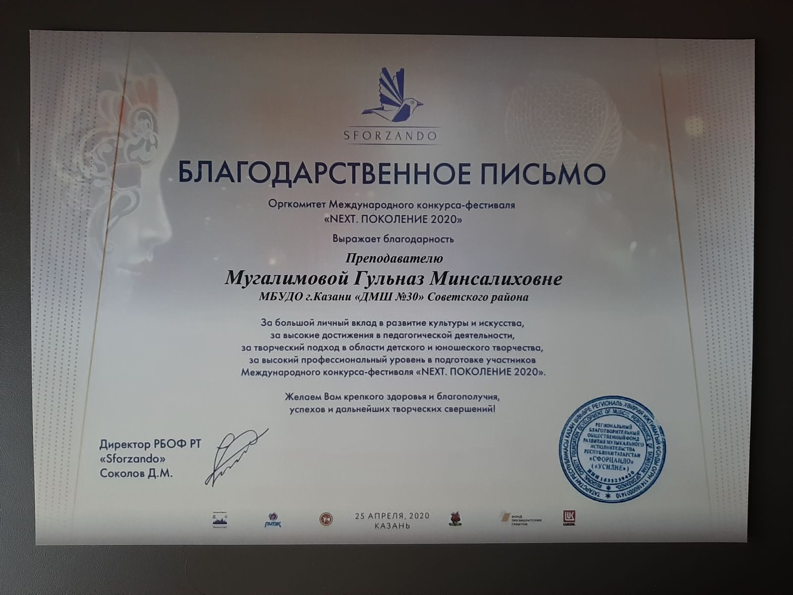 Мкждународный конкурс-фестиваль"NEXT. Поколение-2020" - Мугалимова Г.М. Благодарственное письмо