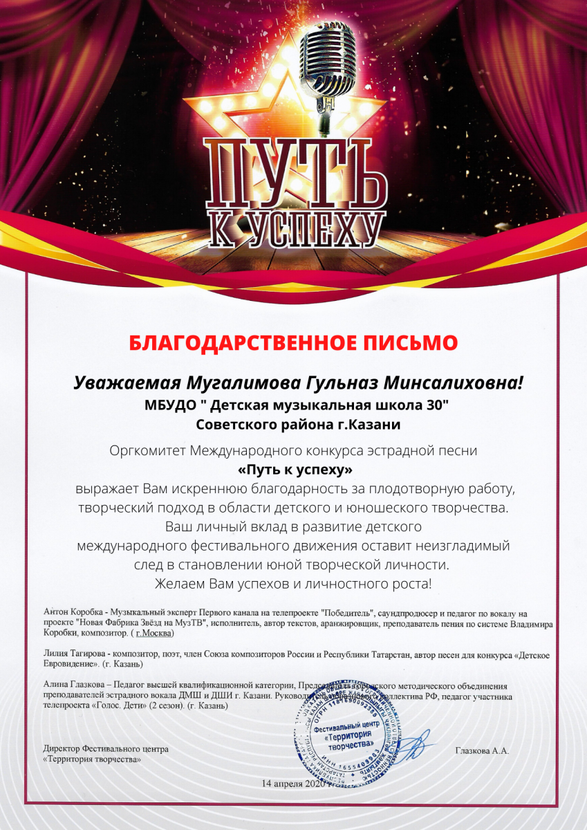 Международный конкурс эстрадной песни "Путь к успеху" - Мугалимова Г.М. - Благодарственное письмо
