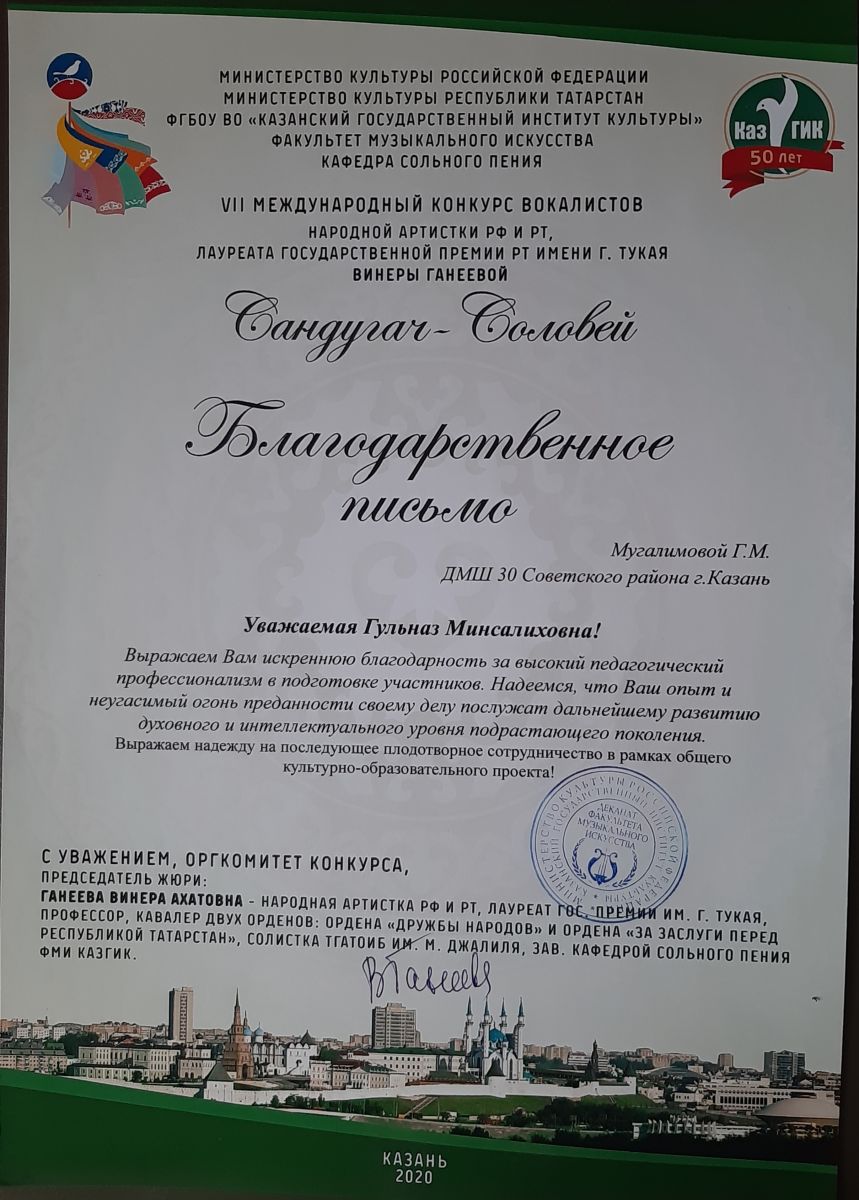 VII Международный кокнурс вокалистов "Сандугач Соловей" - Мугалимова Г.М. - Благодарственное письмо