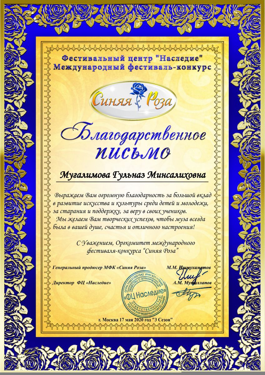 Международный фестиваль-конкукрс "Синяя роза" - Мугалимова Г.М. - Благодарственное письмо