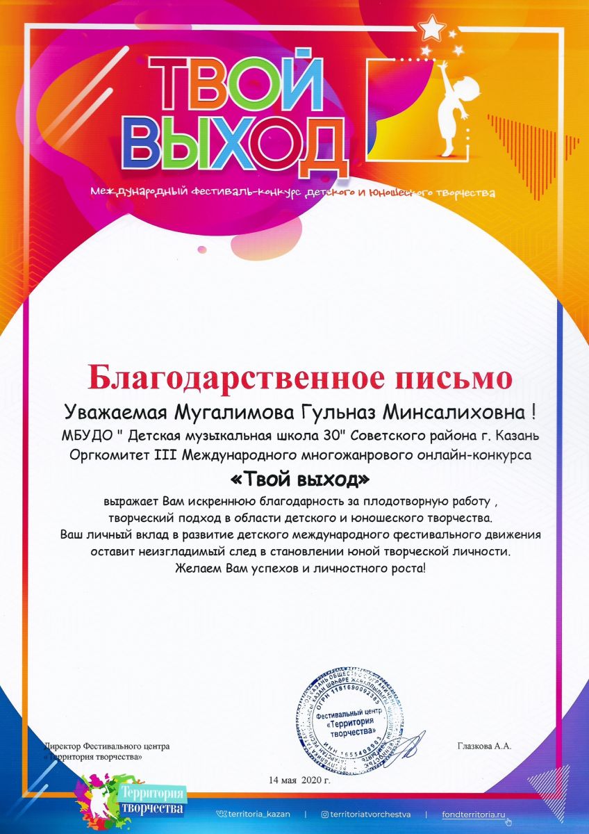 Международный фестиваль-конкурс детского и юношеского творчества "Твой выход" - Мугалимова Г.М. - Благодарственное письмо