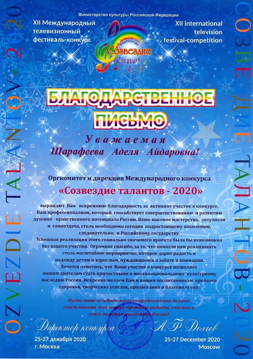 XII Международный телевизионный фестиваль-кокнурс "Созвездие талантов" - Шарафеева А.А. - Благодарственное письмо