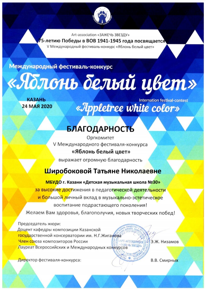 Международный фестиваль-конкурс "Яблонь белый цвет" - Широбокова Т.Н. - Благодарственное письмо