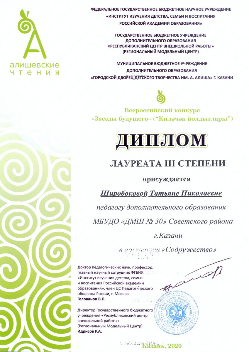 Всероссийский конкурс "Звезды будущего" ("Киләчәк йәлдызлары") в рамках Алишевских чтений - Широбокова Т.Н. - III место в номинации "Содружество"