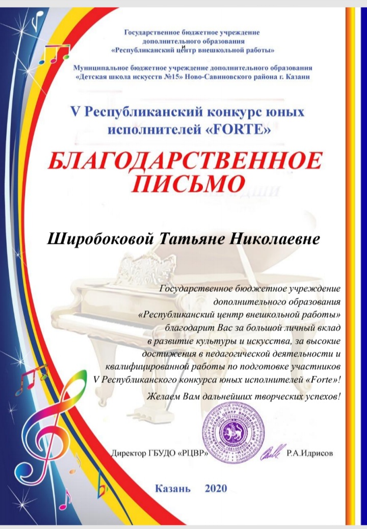 V Республиканский конкурс юных исполнителей "FORTE" - Широбокова Т.Н. - Благодарственное письмо