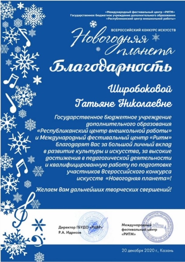 Всероссийский конкурс искусств "Новогодняя планета" - Широбокова Т.Н. - Благодарственное письмо