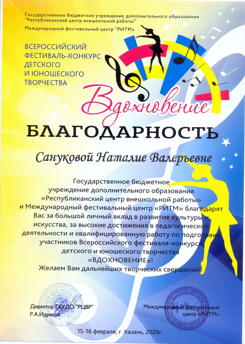 Всероссийский фестиваль-конкурс детского и юношеского творчества "Вдохновение" - Санукова Н.В. - Благодарственное письмо