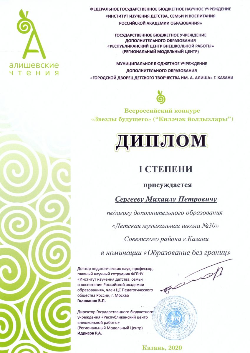 Всероссийский конкурс "Звезды будущего" ("Киләчәк йәлдызлары") в рамках Алишевских чтений - Сергеев М.П. - диплом I степени в номинации "Образование без границ"