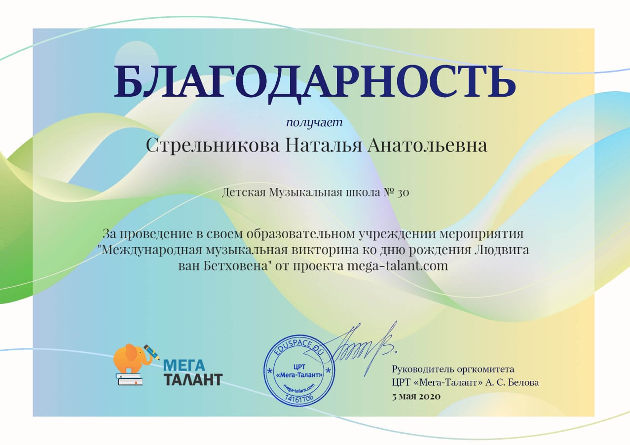 Международная музыкальная викторина ко дню рождения Л.Бетховена "Мега Талант" - Стрельникова Н.А. - Благодарственное письмо