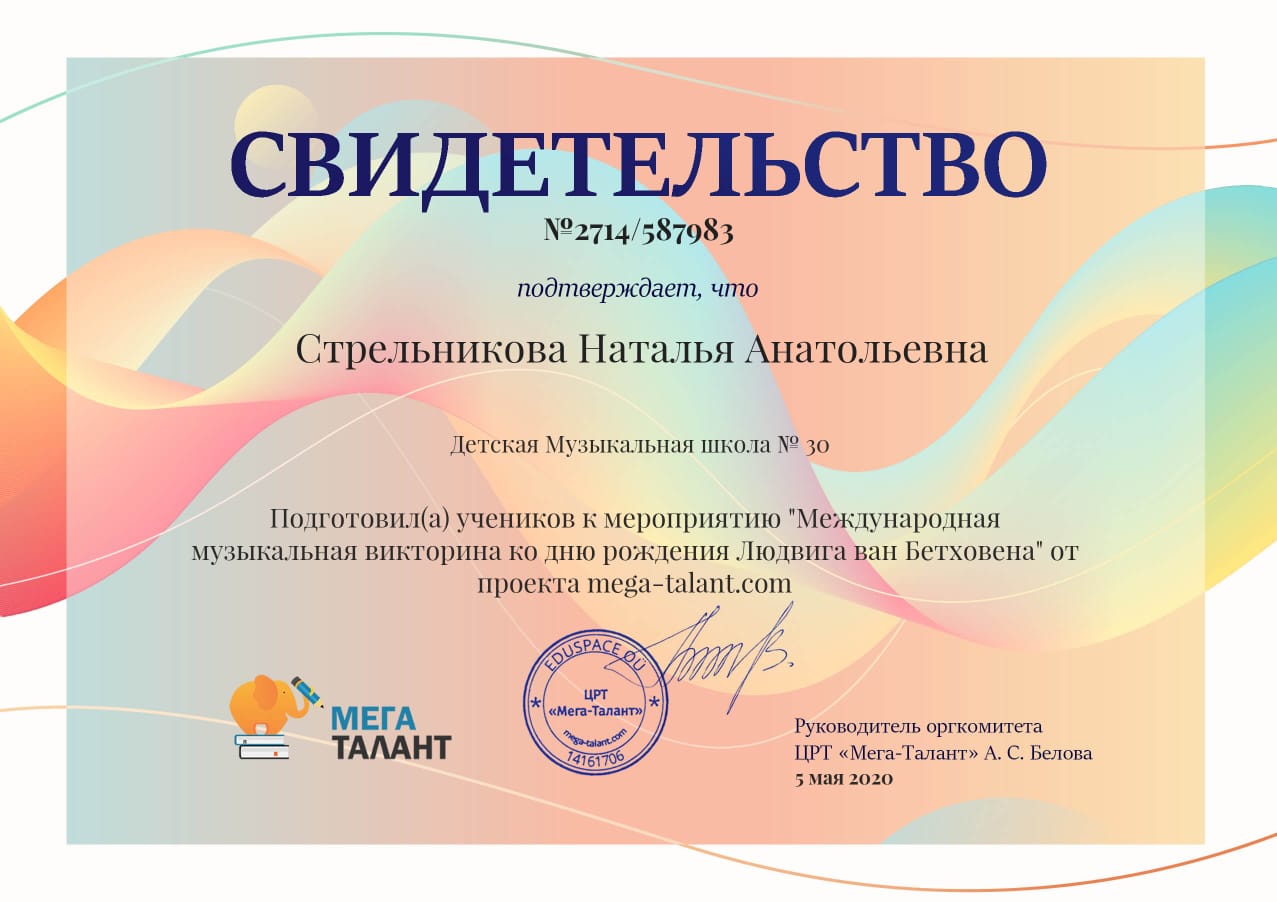 Международная музыкальная викторина ко дню рождения Л.Бетховена "Мега Талант" - Стрельникова Н.А. - свидетельство подготовки лауреата