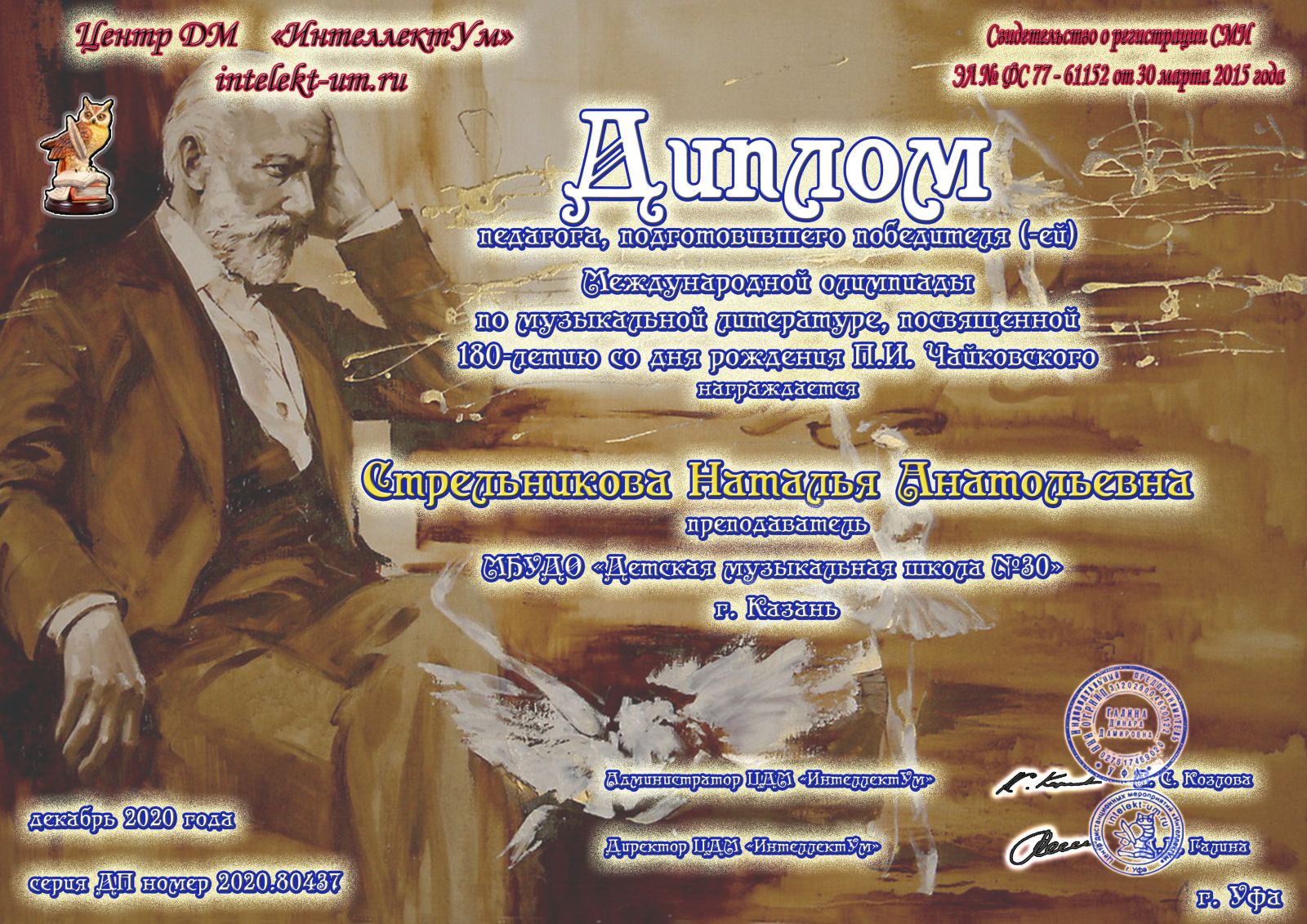 Международная олимпиада по музыкальной литературе, посвященной 180-летию со дня рождения П.И.Чайковского - Стрельникова Н.А. - Благодарственное письмо