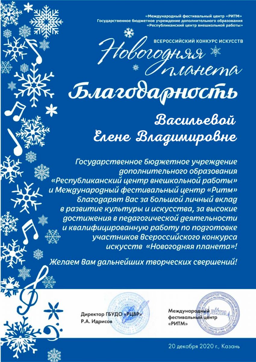 Всероссийский конкурс искусств "Новогодняя планета" - Васильева Е.В. - Благодарственное письмо