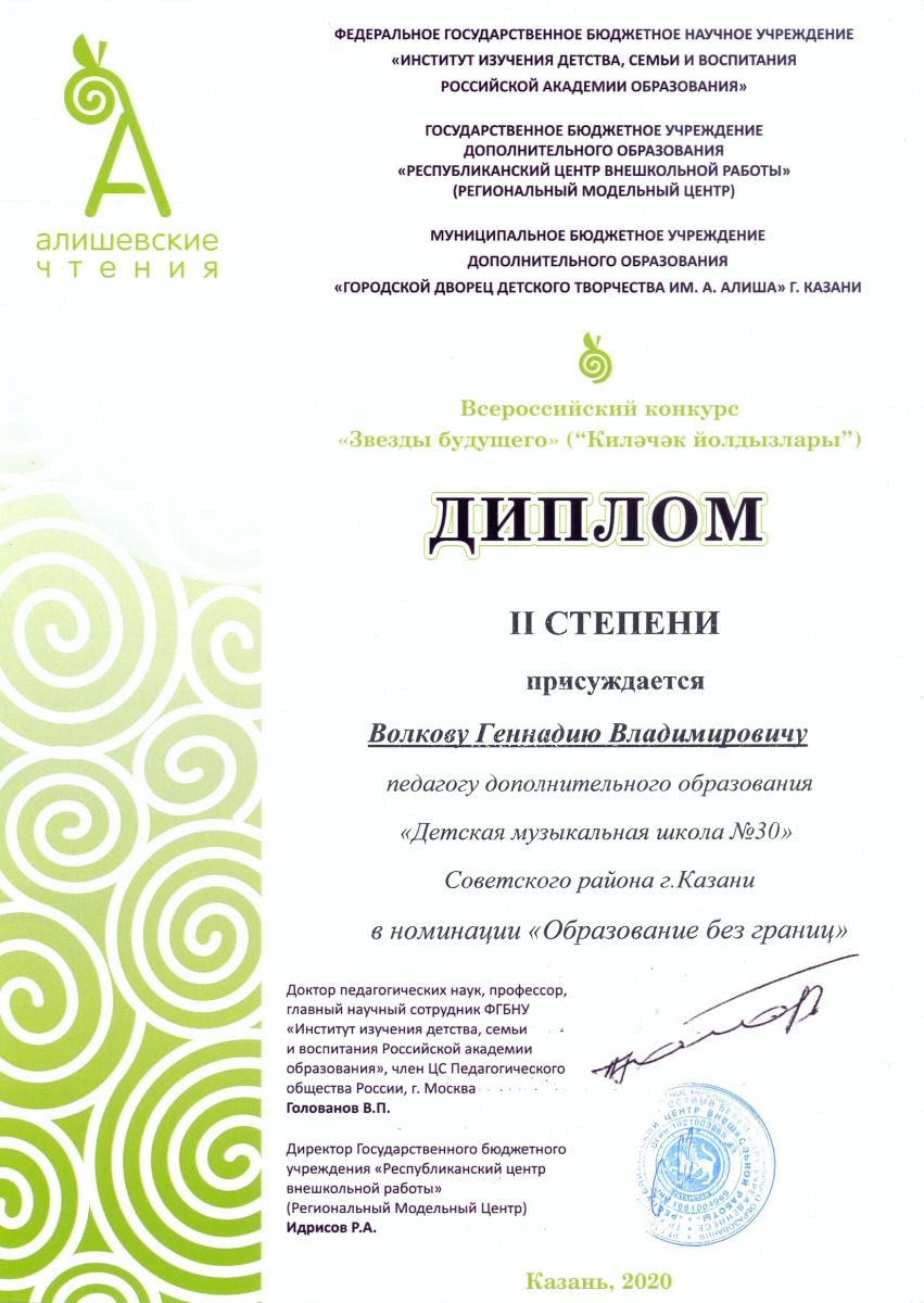 Всероссийский конкурс "Звезды будущего" ("Киләчәк йәлдызлары") в рамках Алишевских чтений - Волков Г.В. - диплом II степени в номинации "Образование без границ"