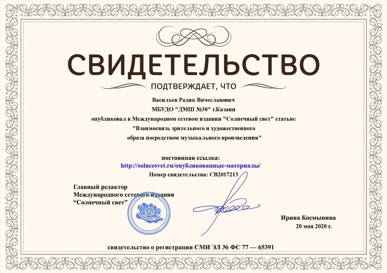 Международное сетевое издание "Солнечный свет" - статья Васильева Р.В. "Взаимосвязь зрительного и художетсвенного образа посредством музыкального произведения"
