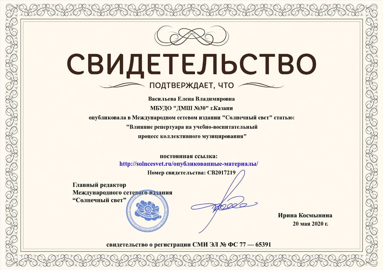 Международное сетевое издание "Солнечный свет" - статья Васильевой Е.В. "Влияние репертуара на учебно-воспитательный процесс коллективного музицирования"