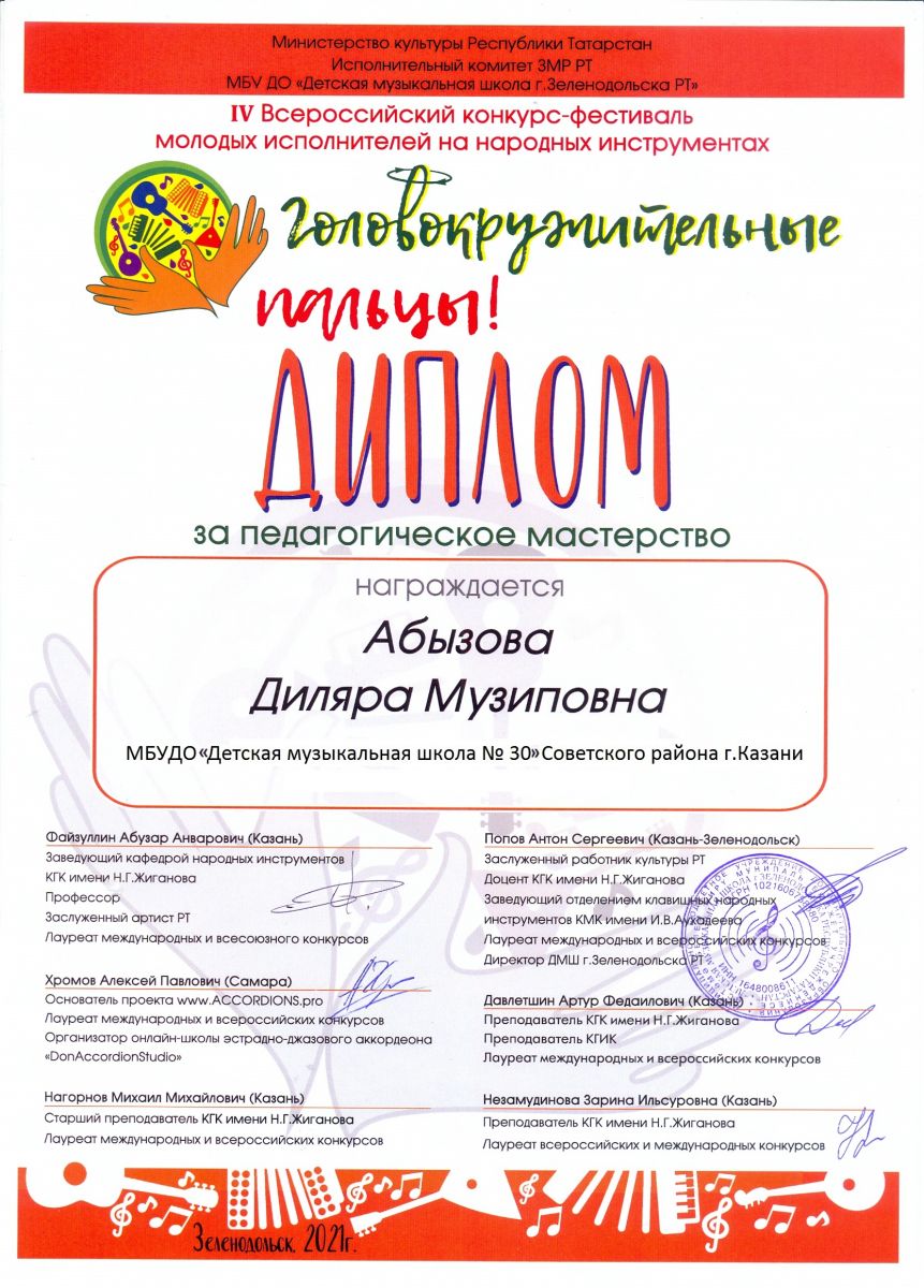 IV Всероссийский конкурс-фестиваль молодых исполнителей на народных инструментах "Головокружительные пальцы" - Абызова Д.М. - диплом