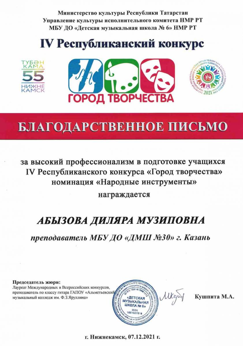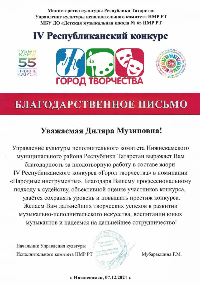 IV Республиканский конкурс "Город творчества" - Абызова Д.М. - член жюри в номинации "Народные инструменты" - Благодарственное письмо