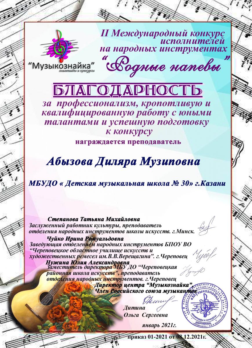 II Международный конкурс исполнителей на народных инсрументах "Родные напевы" - Абызова Д.М. - Благодарственное письмо
