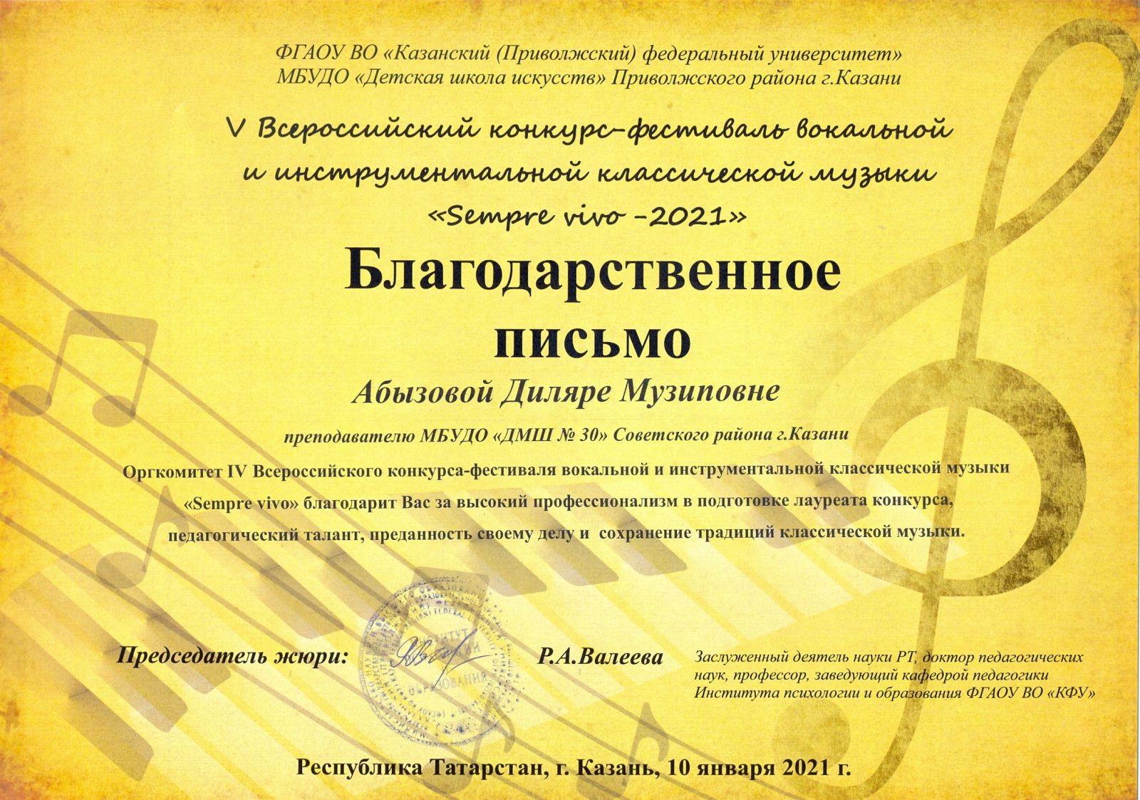 V Всероссийский конкурс-фествиаль вокальной и инструментальной классической музыки "Sempre vivo" - Абызова Д.М. - Благодарственное письмо