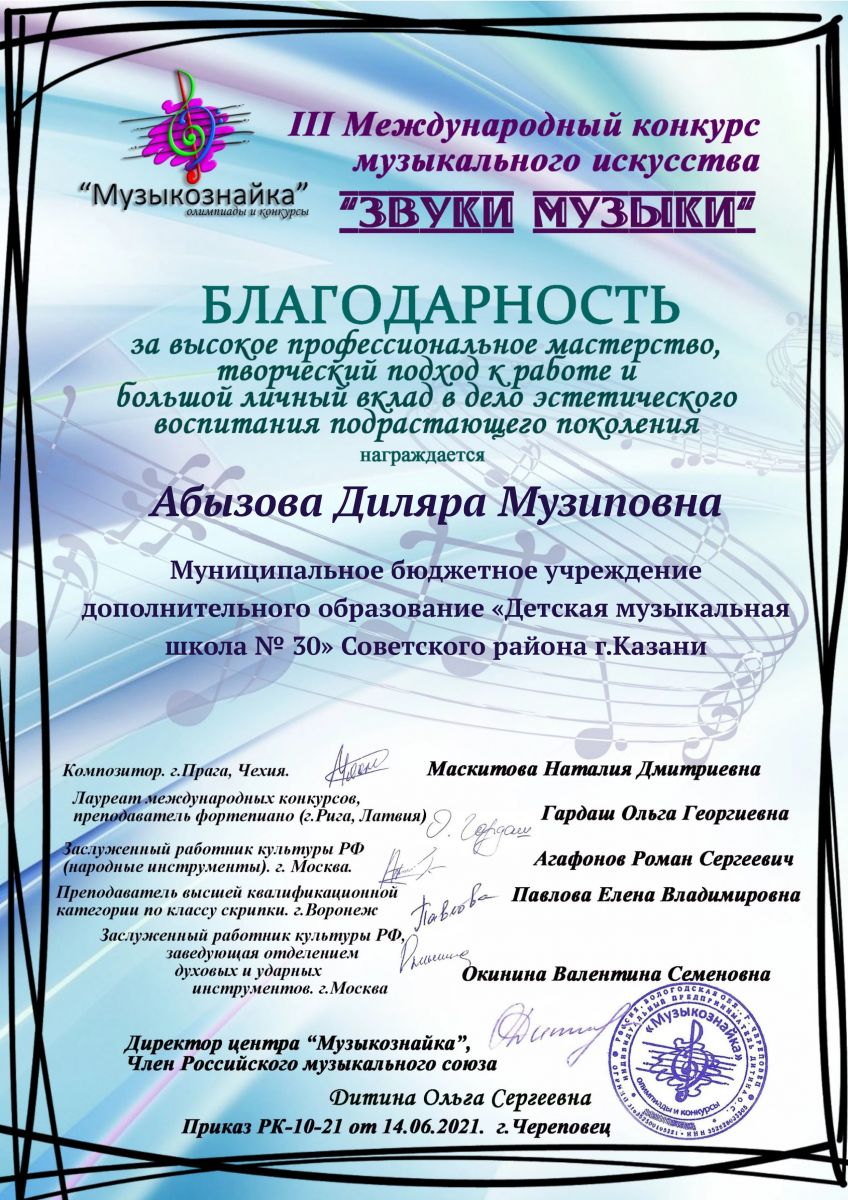 III Меджународный конкурс музыкального искусства "Звуки музыки" - Абызова Д.М. - Благодарственное письмо