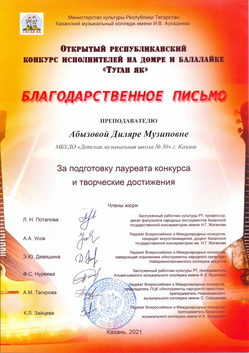 Открытый Республиканский конкурс исполнителей на домре и балалайке "Туган як" - Абызова Д.М. - Благодарственное письмо