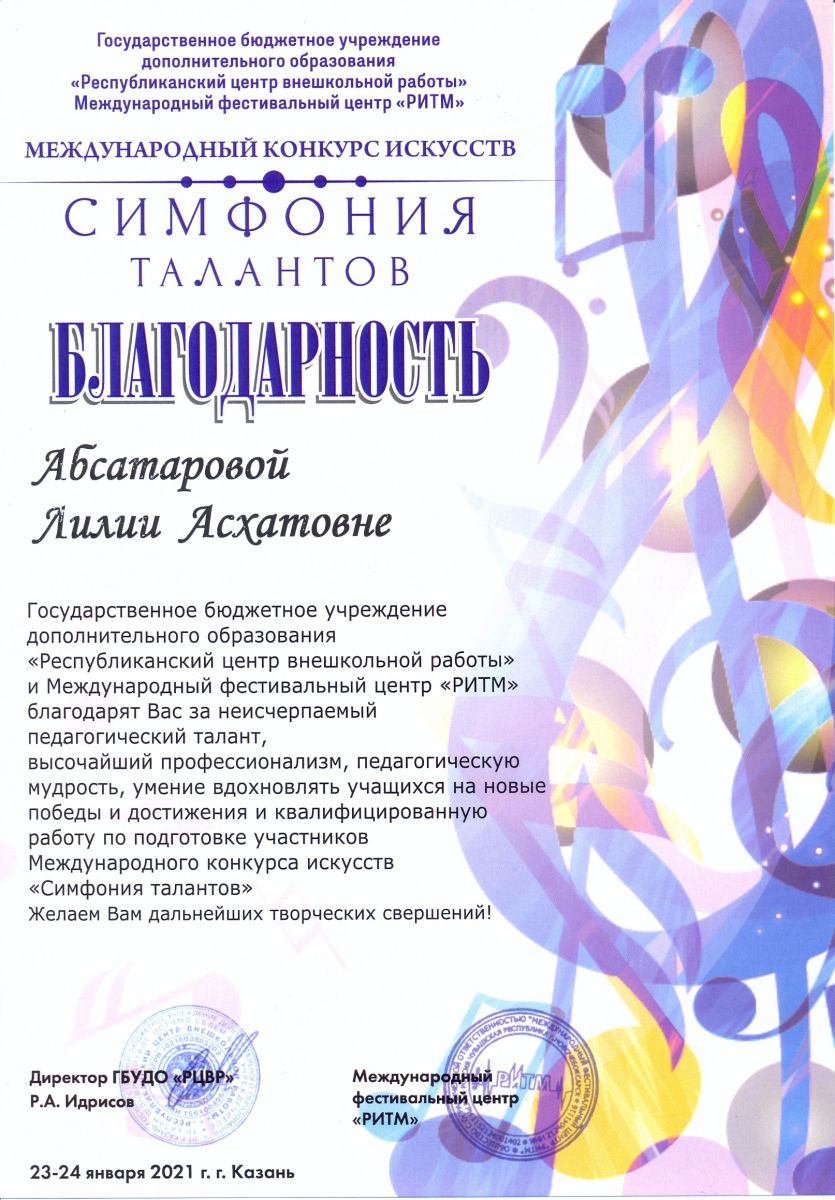 Международный конкурс искусств "Симфония талантов" - Абсатарова Л.А. - Благодарность