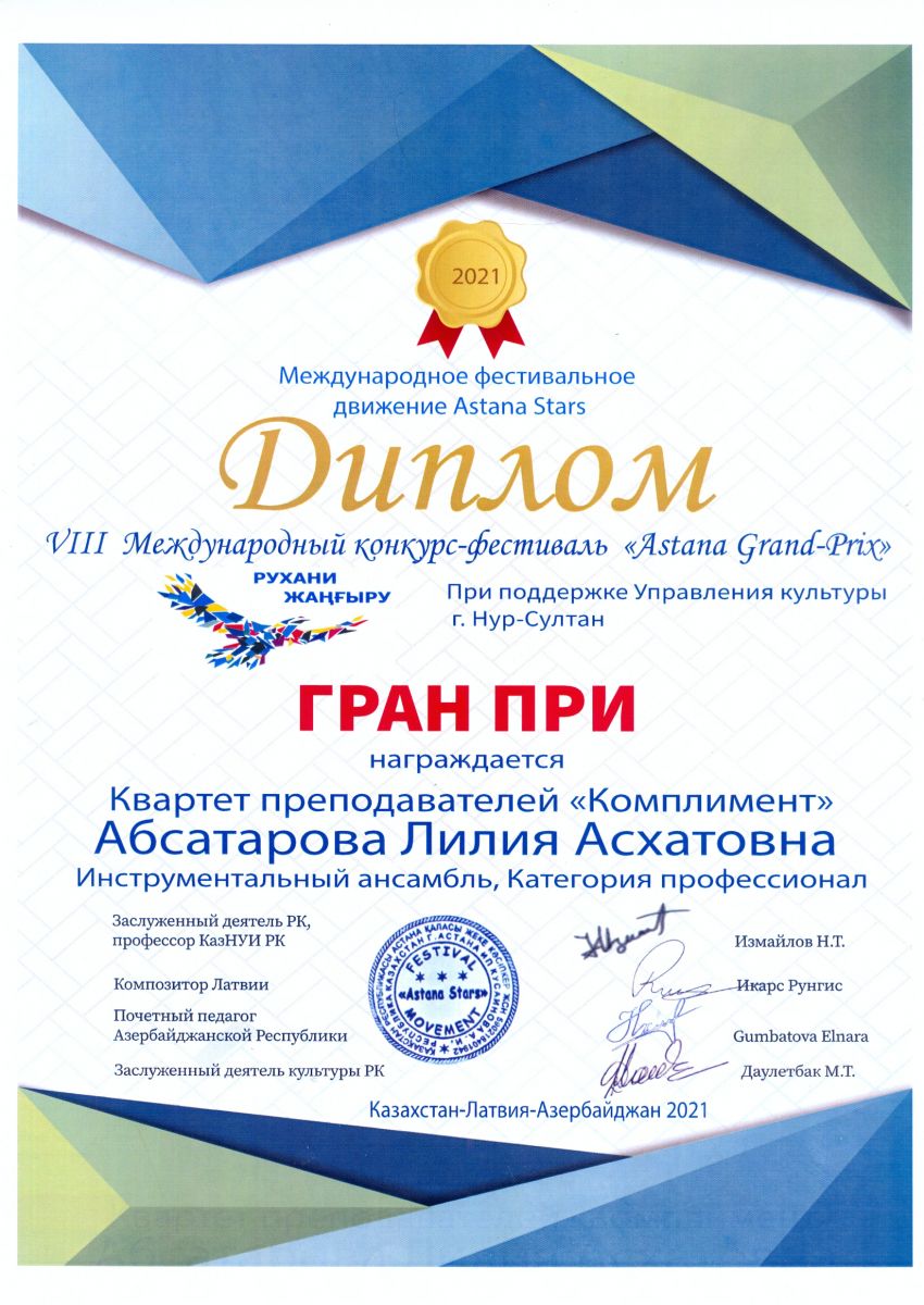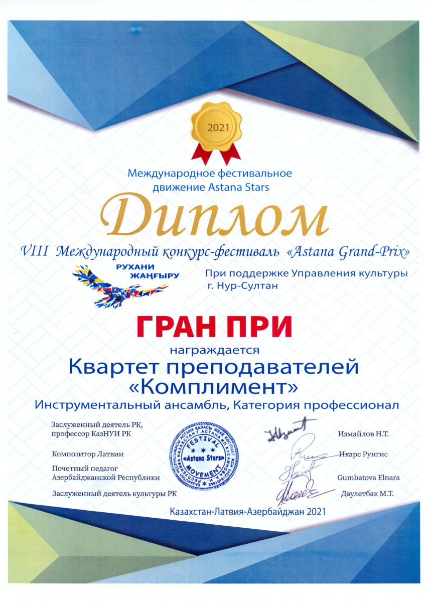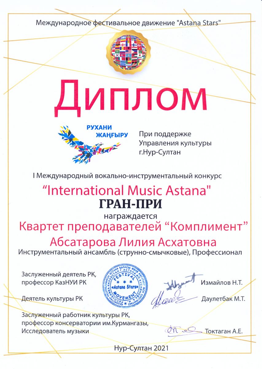 I Международный вокально-инструментальный конкурс "International Music Astana" - Абсатарова Л.А. в составе квартета преподавателей "Комплимент" - Гран-при