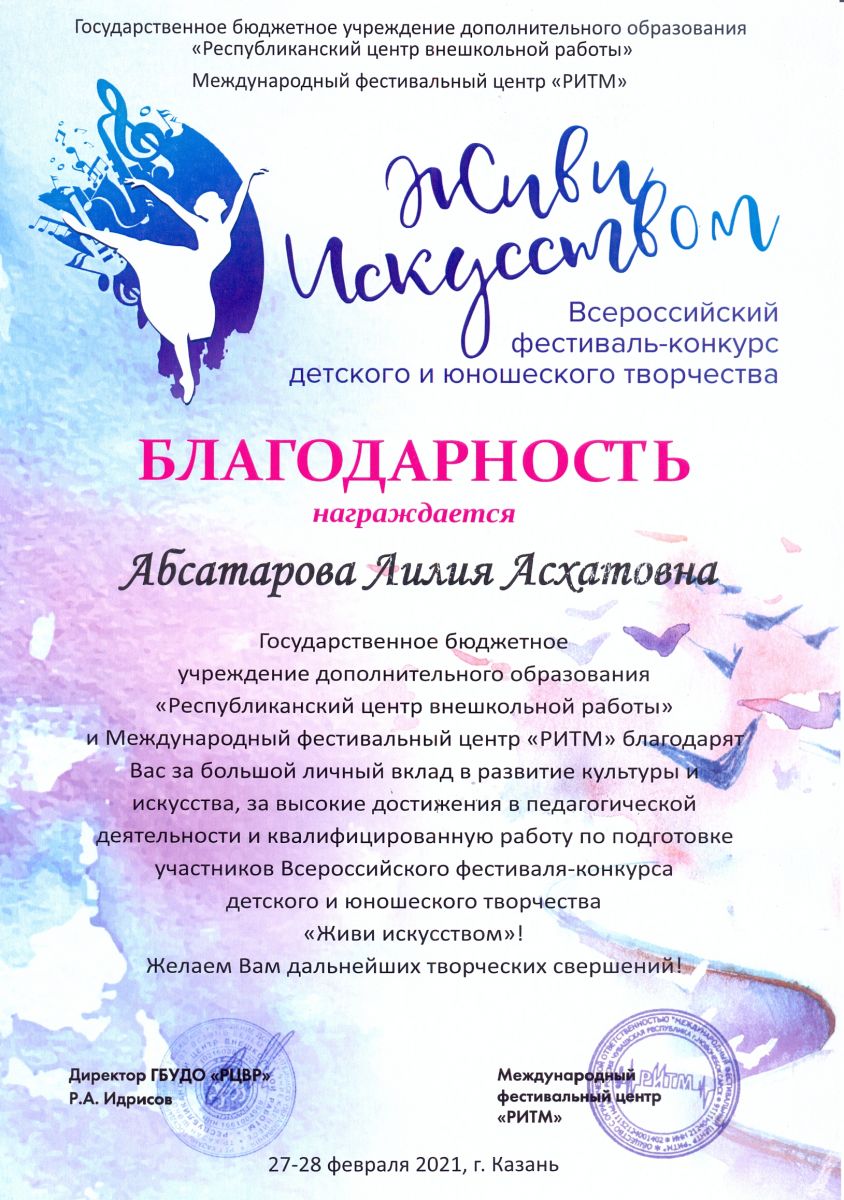 Всероссийский фестиваль-конкурс детского и юношеского творчества "Живи искусством" - Абсатарова Л.А. - Благодарность